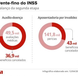 No caso do auxílio-doença, os beneficiários foram convocados para novas perícias. De acordo com o Ministério do Desenvolvimento, na primeira fase, entre 2016 e fevereiro de 2018, foram realizadas 252 mil revisões de um universo de 553 mil previstas. Destas, 228 mil foram canceladas, seja por indicação da perícia ou por não comparecimento, um índice de cerca de 82%.