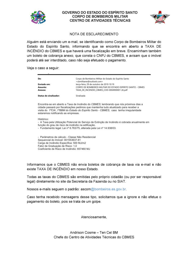 Além disso, os Bombeiros também orientam que é preciso acionar a Polícia nesses casos. É essencial que o cidadão não pague o boleto e não faça contato com os bandidos. “Informamos que o CBMES não envia boletos de cobrança de taxa via e-mail e não existe TAXA DE INCÊNDIO em nosso Estado. Todas as taxas do CBMES são emitidas pelo próprio cidadão (ou por ser responsável legal) diretamente no site da Secretaria da Fazenda ou no SIAT. Nossos e-mails seguem o padrão: ascom@bombeiros.es.gov.br.