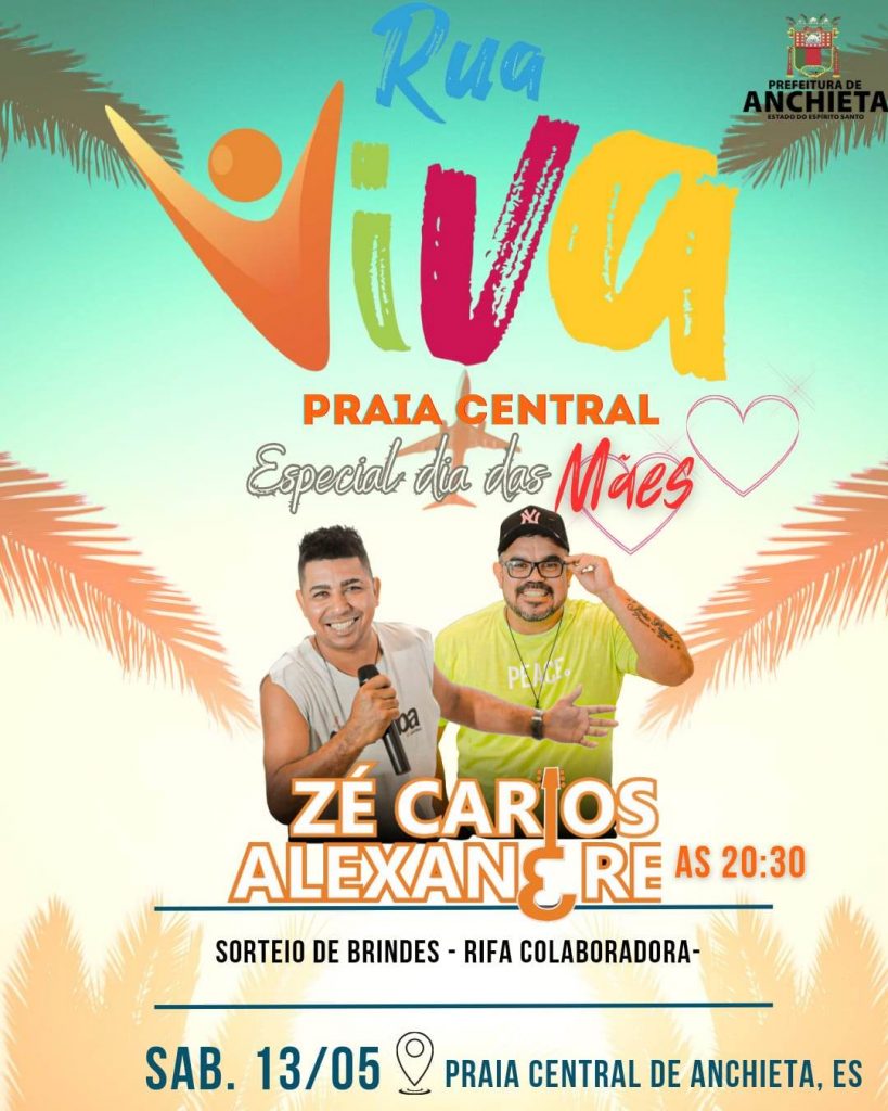 O projeto Rua Viva , desenvolvido pelos comerciantes do centro de Anchieta e com o apoio da Prefeitura Municipal de Anchieta , tem atraido uma multidao nos finais de semana na cidade do Santo Padre , litoral Sul , e nesse sabado dia 13/05 tem uma super programação para a população e os turistas , sera uma Rua Viva especial dia das Mães, a rua sera fechada a partir das 17:00hs , lazer , gastronomia e muita diversão, e um super Show com Zé Carlos e Alexandre, bora pra Anchieta curtir esse super evento.![]()